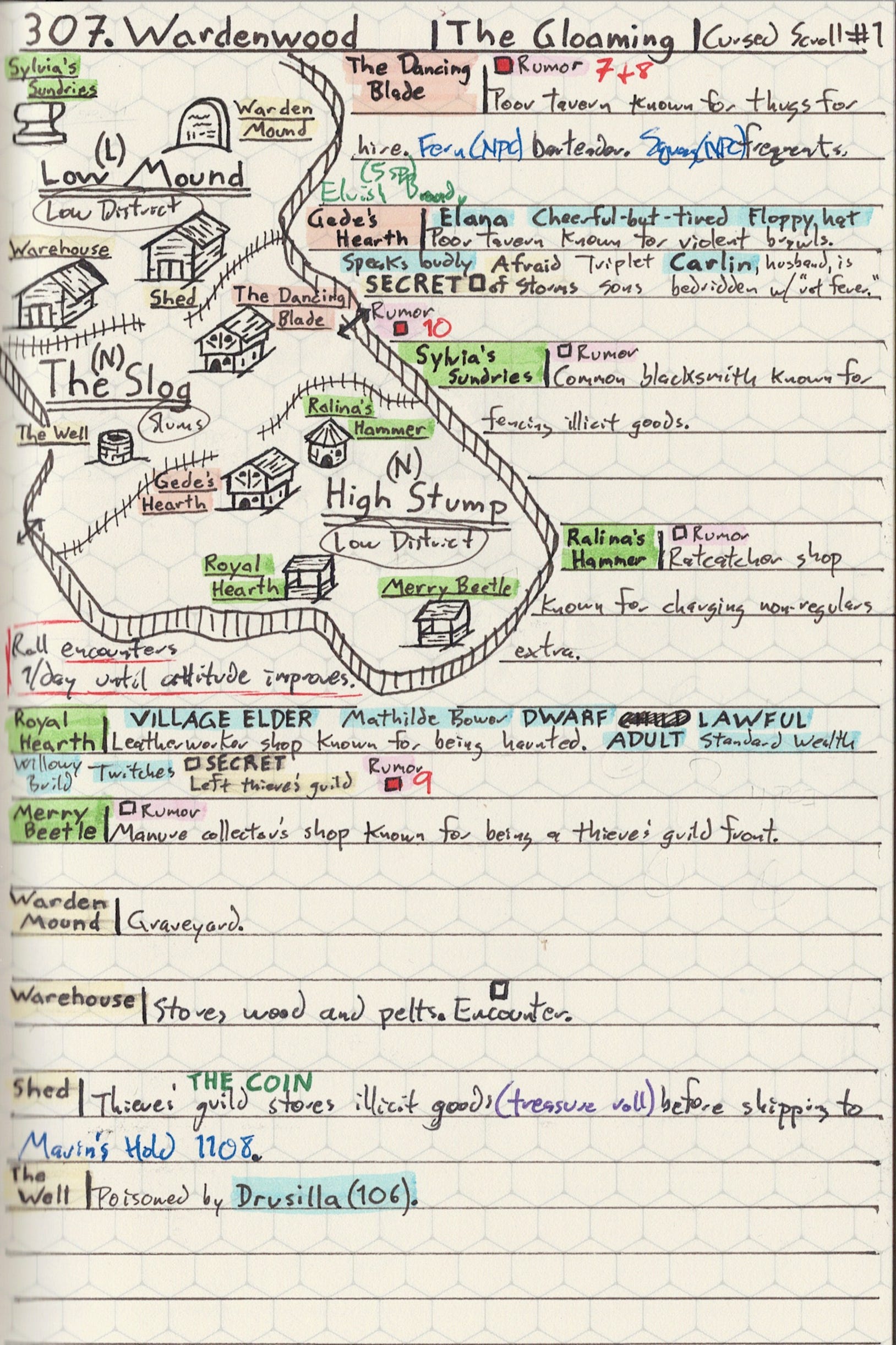 Another example is the list of rumors. I have used rumors before, but it has been a long time. When I was preparing for this game, I wrote them all down in my notebook and gave them numbers. I decided that each time they went into an establishment at the settlements they would hear another rumor, essentially giving them a quest without having to go to a quest-giver or look at a job board. I also spent time detailing the settlements, because I like maps, and I like making them. So I just checked the boxes and marked off the rumors they heard. It was obvious, I saw it on their face when I rolled out the first one, but I think they also understood what I was trying to do. To give them the necessary information, remember, give them all of the information, in a way that felt more authentic.
