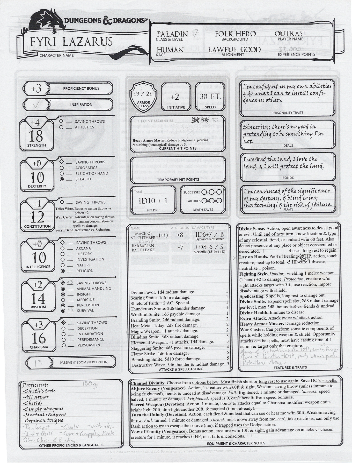 At that moment, a seed was planted in my character. Over time, as we made our plan to escape, we eventually did, and we began to work against the Overlord, my character transitioned from a fighter to a paladin of St. Cuthbert (multi-classing).