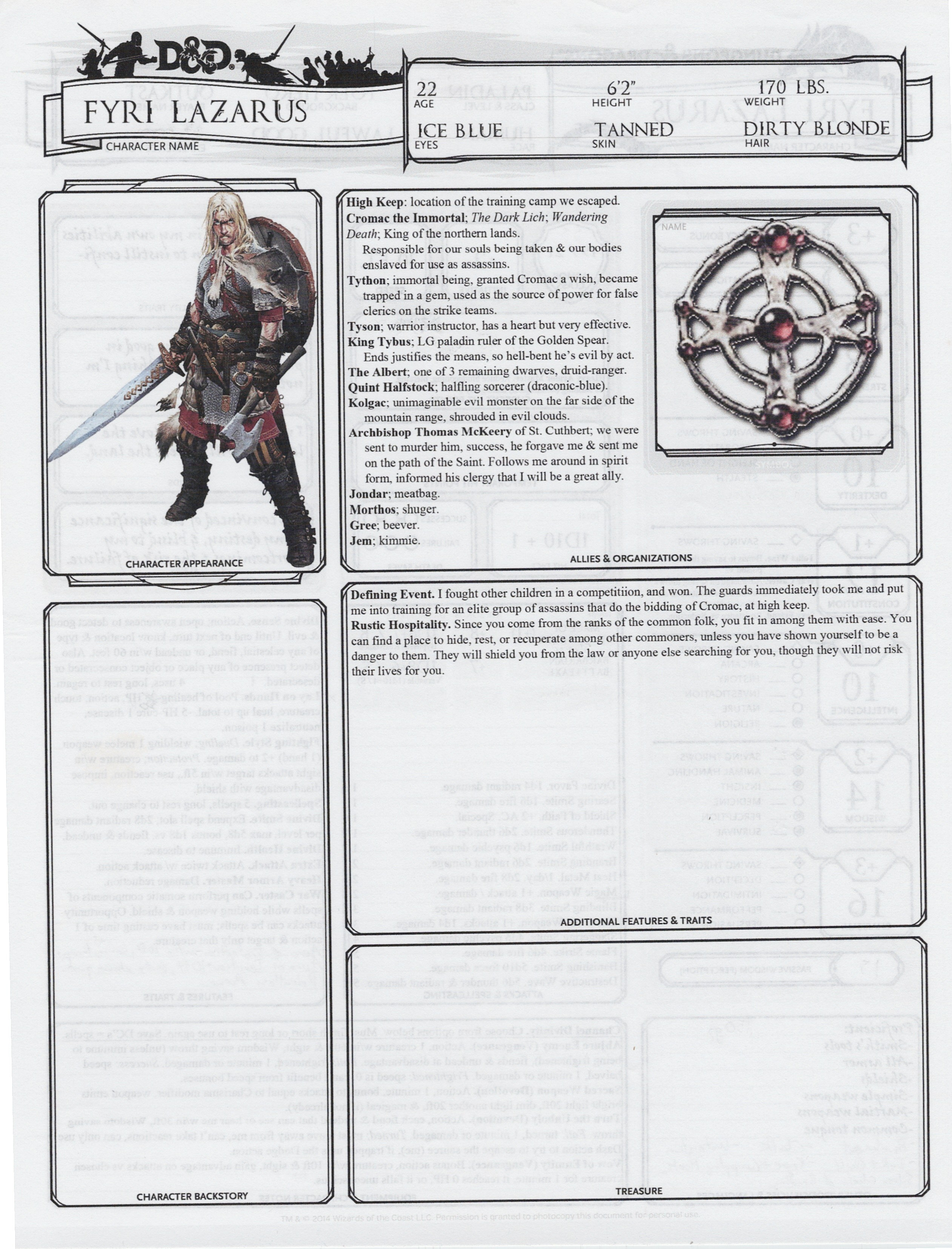 There was never any name for this campaign, so I will name it myself. My friend has this idea that our party would be an elite team of assassins for the evil overlord of the realm. The Overlord and his vizier would travel across the land looking for children with “the spark,” the innate trait that would eventually lead them to the greatness of adventurers. These children were then taken, forced into brutal training camps, and made into the Overlords elite assassins.